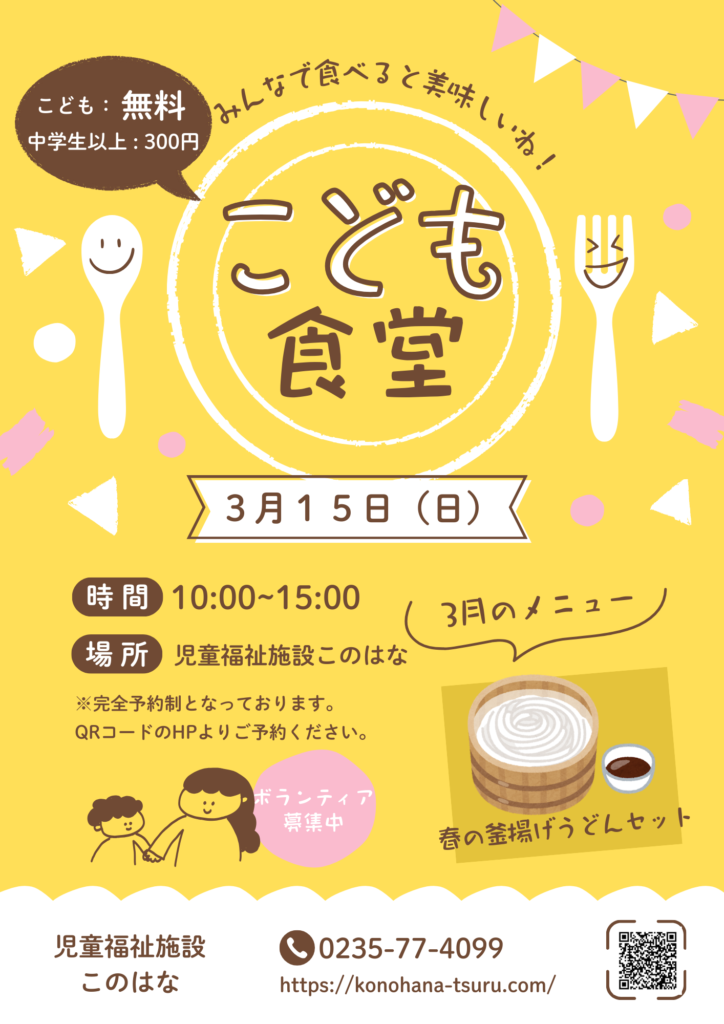 第三回 こども食堂「このはな」令和8年3月15日(日)開所時間:10:00~15:00お食事提供:12:15予定こちらは、こども食堂「このはな」への参加申込フォームです。当日は、お子さまが安心して過ごせる居場所として、食事と交流の時間を提供...